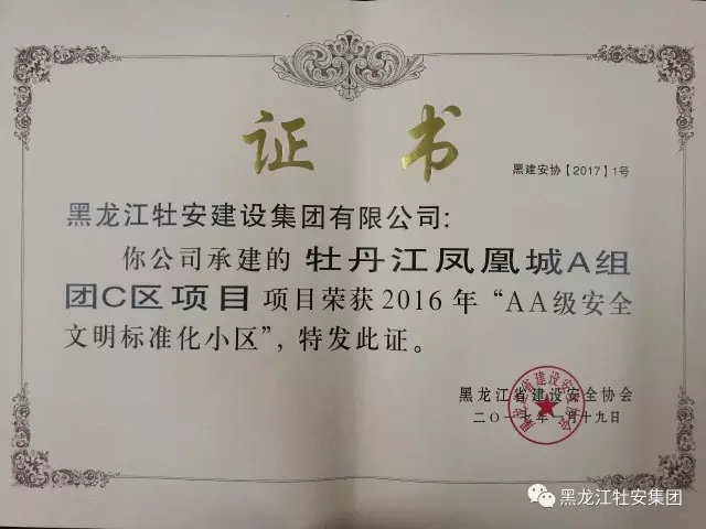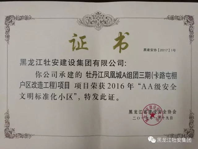 日前,由我公司承建的牡丹江鳳凰城A組團三期(卡路屯棚戶區改造工程)項目和牡丹江鳳凰城A組團C區項目,被省建設安全協會評為2016年度“AA級安全文明標準化小區”。張化民、李強分別被授予“全省建設安全管理優秀項目負責人”稱號。對獲得榮譽的同志表示祝賀的同時,也希望他們在今后的工作中戒驕戒躁再接再厲,充分發揮典范作用,繼續做好施工現場安全文明標準化工作,加強安全生產和文明施工管理,推動我公司安全文明標準化工作提升水平,再上新臺階。