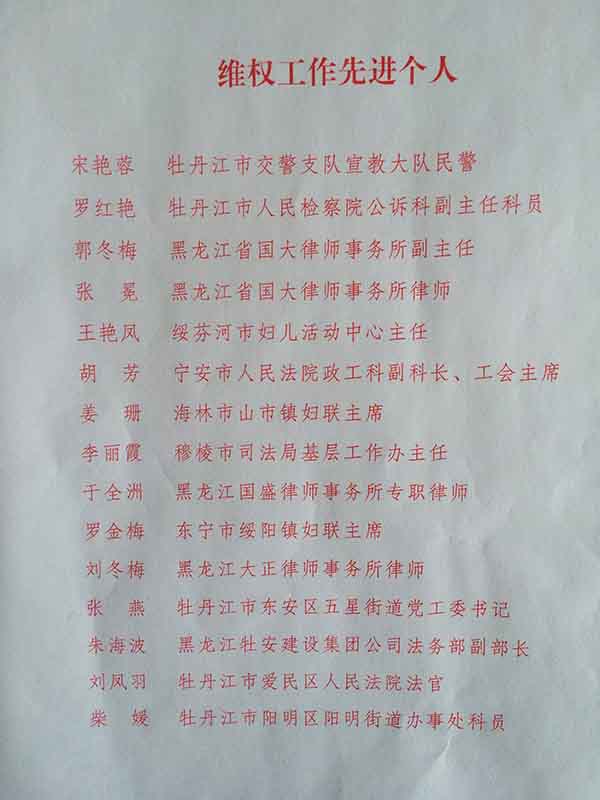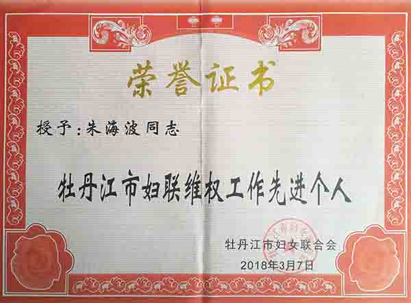 集團公司法務總副部長、機關支部書記朱海波,始終堅持把滿腔的熱情化作工作的動力,在公司工會的正確領導下,以維護女職工合法權益為主題,提高全體女職工素質為目標,充分調動了廣大女職工的積極性、創造性,為構建企業和諧發展做出了積極的貢獻。維護好女職工的合法權益和特殊利益,是婦委會基本職責和不可推卸的責任,積極開展權益保障行動,把維護女職工的合法權益作為一切工作的出發點和落腳點。關心困難女職工生產和生活情況,定期開展“愛心送溫暖”幫扶活動,并組織廣大女職工積極參與牡丹江市組織的“我為雪城添新綠”“關愛母親河”“金秋助學”“共享陽光關愛留守兒童”等系列公益活動,充分調動廣大女職工向社會伸出互助友愛之手,共同構建牡安集團正能量愛心聯盟。她榮獲牡丹江市婦女聯合會“維權先進個人”光榮稱號。